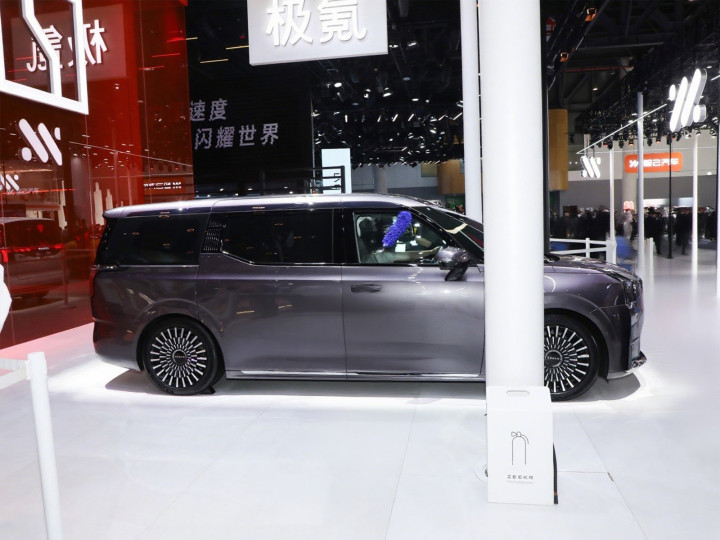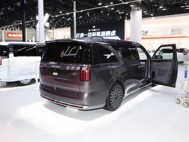 车身侧面延续了ZEEKR 009的方正美学,5217mm超长车身通过悬浮式车顶与隐藏式B柱设计,营造出浑然一体的视觉延伸感。2024mm同级最宽车身配合1812mm高度,构成黄金比例的车身姿态,双侧电动滑移门开启后36cm超低门槛高度,配合全自动空气悬架系统,形成优雅的"尊贵上下仪式"。腰线采用"光之轨迹"三维立体雕刻工艺,从前翼子板贯穿至尾灯,在光影变化中呈现动态流动效果。21英寸涡扇轮毂采用航空级锻造工艺,搭配265/45 R21低扁平比轮胎,既保证了MPV的舒适性需求,又保留了运动基因。车侧Smart Bar触控面板集成空调、门锁等控制功能,B柱上的中文字体按键与无框式车窗设计,彰显出东方美学与现代科技的融合。