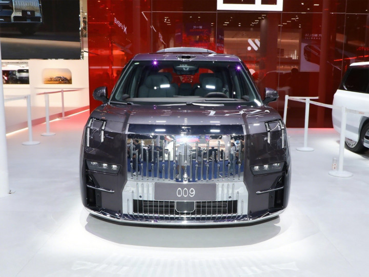 我们首先来看新车的外观设计方面,ZEEKR 009的车头设计堪称现代工业美学的典范,其独创的"光之泉"灯语交互系统由154颗LED光源组成,可根据场景智能切换迎宾、充电等8种动态光效。垂直排列的镀铬格栅采用帕特农神庙式对称布局,2米宽的金属中网在阳光下呈现渐变式光影流动,既延续了劳斯莱斯的庄重感,又通过数字化灯带实现了新能源车型的科技表达。分体式矩阵大灯组包含32颗独立调光单元,支持自适应远近光与自动转向功能,夜间照射宽度达15米。前舱盖上的ZEEKR徽标采用悬浮式设计,与贯穿式日行灯形成视觉延伸,这种"光刃"式设计语言在降低风阻系数0.28的同时,赋予了车头未来战舰般的凌厉气势。